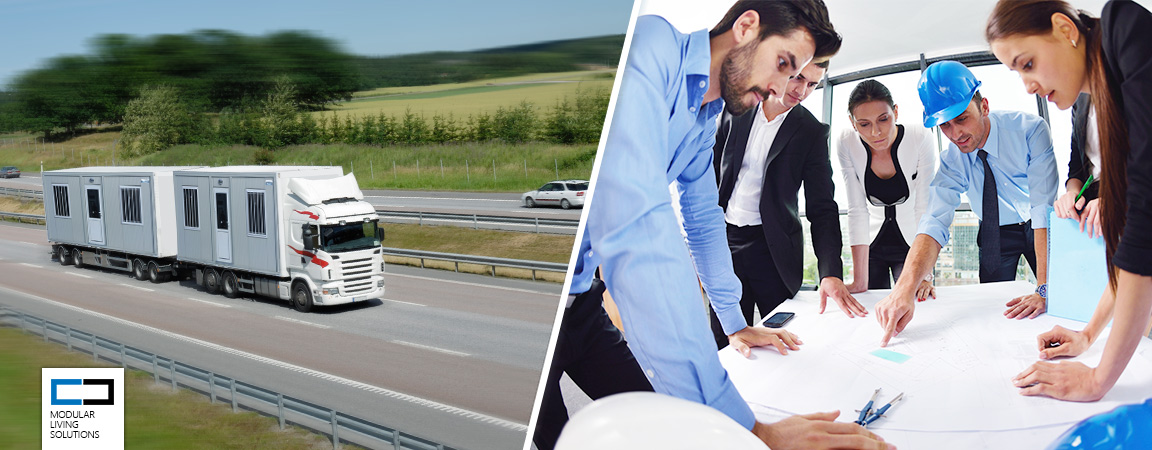 Eine Gruppe von 13 Sanitäts- und Bürocontainers neben einem Bauplatz