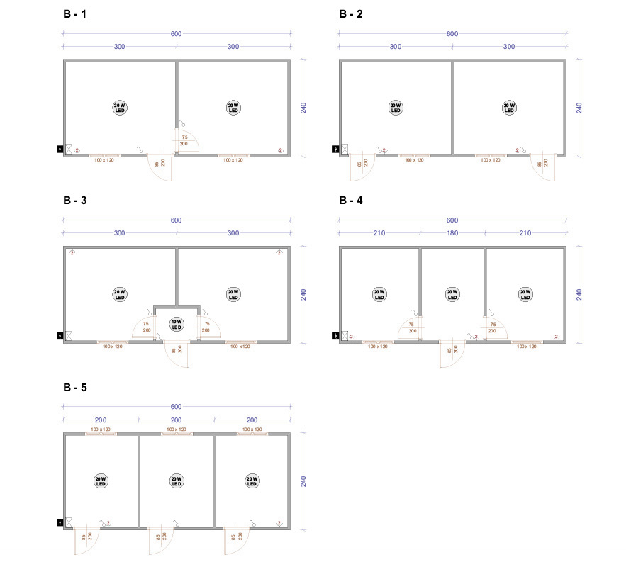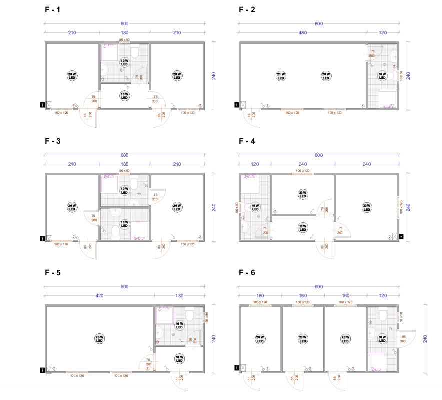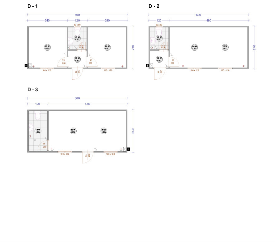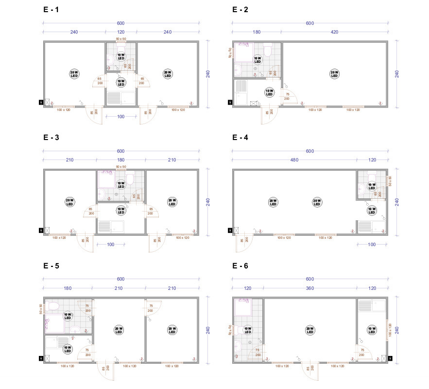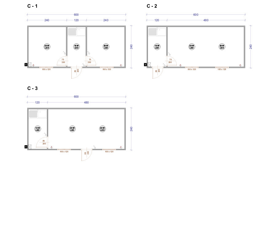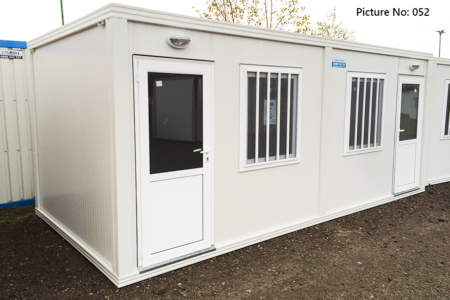 Die Containers werden mit galvanisierten Stahlkonstruktion hergestellt. Die Ausdauer des Standardbodens ist 200kg/qm. Die Isolationsschicht kann 4cm- oder 8cm dicken Sandwich panel in Farbe RAL 9002 mit 4-Kammer-österreichischen PVC-Fenster sein. Ein Standardcontainer mit Größe 240x600cm enthält zwei Steckdosen, Elektrobox mit Schutzvorrichtungen und LED-Lampen. Der Bodenbelag im Bad ist Terrakotta. Die WC- und Badausstattung ist ein Waschbecken, ein Spiegel, eine Dusche und WC. Die Größe einer Standardküchenausrüstung ist 80x50x100 cm. Die Standardküchenausrüstung enthält ein Waschbecken, Wasserhähne und zwei Schränke - oben und unten.