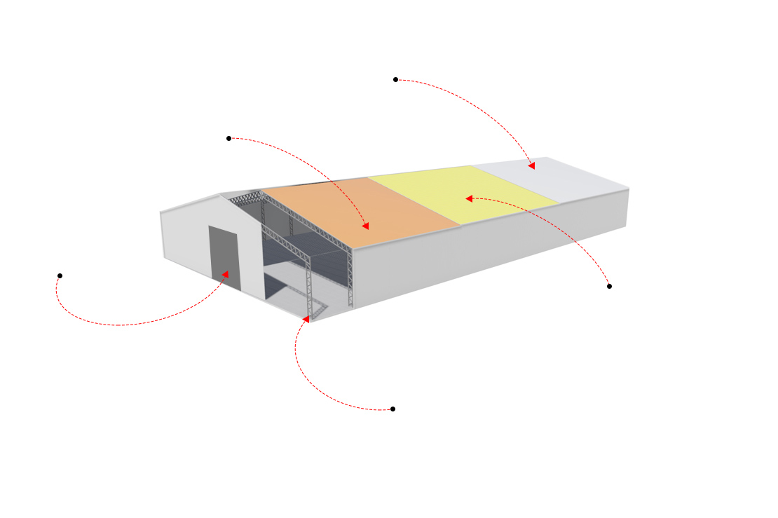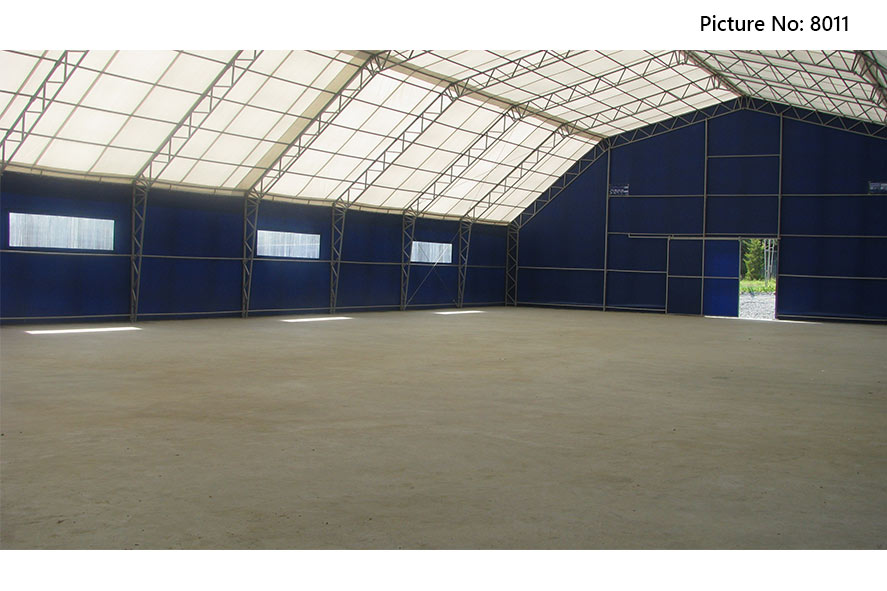 Die Zelte haben ein größes Innenraum und können zum Lagern benutzt werden. Die Isolationsschicht sichert eine Temperaturunterschied. Das Foto unten zeigt die Innenaussicht des montierten Zeltes. Zuerst montiert man die Stahlkonstruktion, dann die Isolationsschicht von Mineral wool und am Ende die Zeltleinwände. Die Zelte haben ein Durchlüftungssystem.