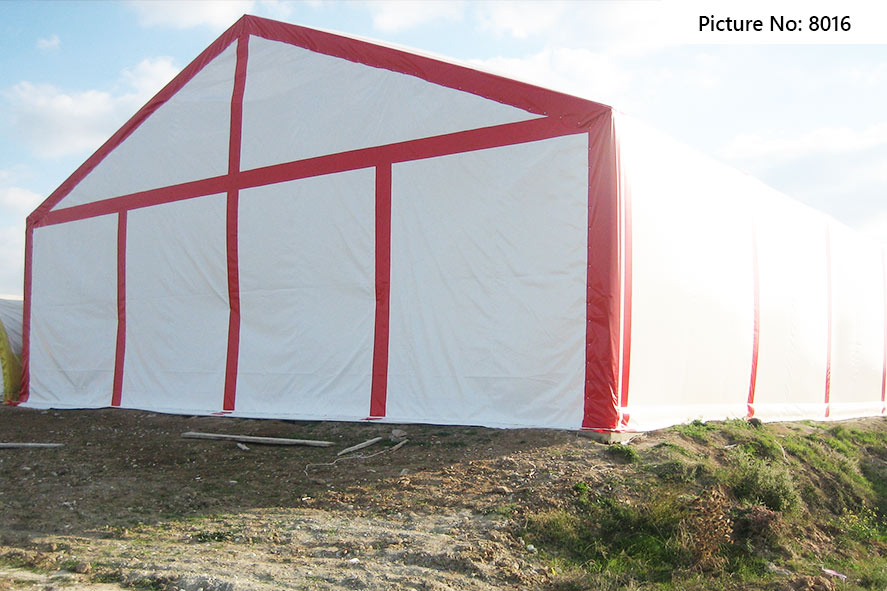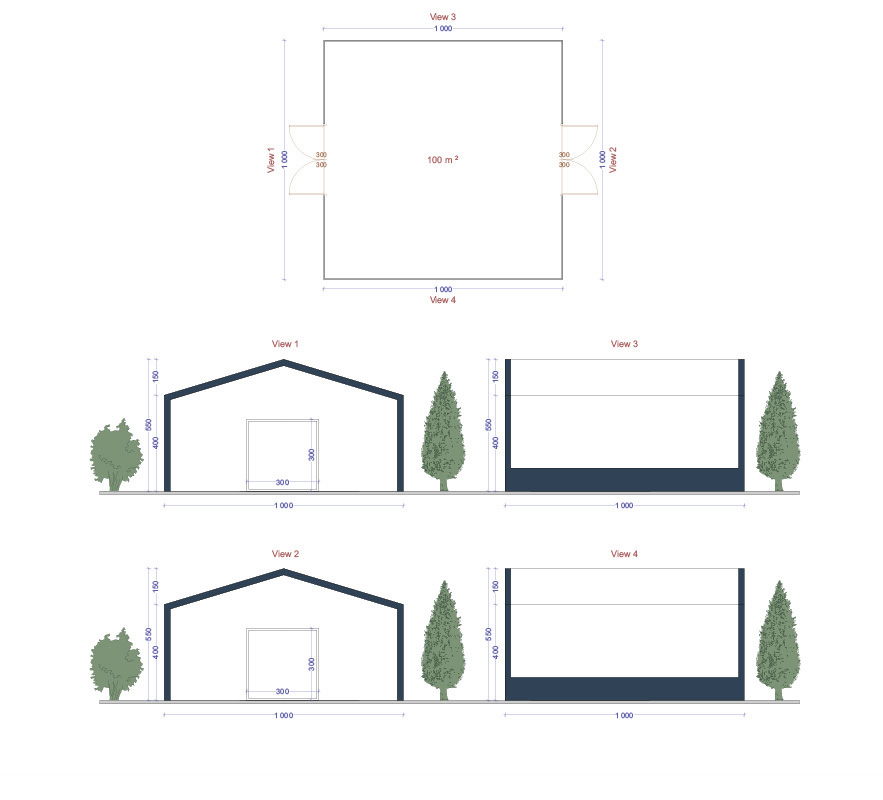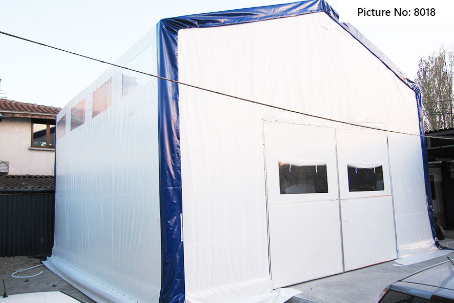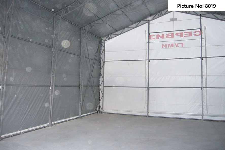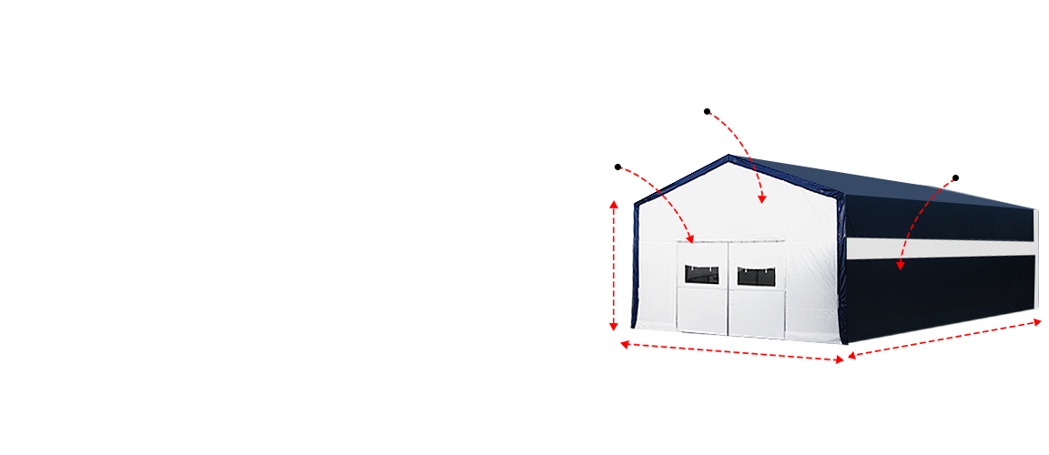 Man kann die Breite, die Länge und die Höhe nach den Bedürfnissen der Kunden verändern. Die Musterzeichnung unten ist zu einem Lagerraum. Ihrem Wunsch nach kann man die Fenster-, die Türen- und die Zeltgröße ändern.