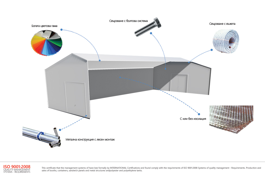 650 Gramm-Polyesterzeltleinwände. Gestrihene Stahlkonstruktion hoher Qualität. Mineral wool - Isolationsschicht. Breites Innenraum.